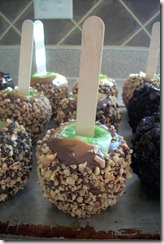 After I dipped the apples in the caramel I let them sit in the refrigerator for about 30 minutes to an hour. After an hour I took them out and dipped them in milk chocolate. (sorry I forgot to take pictures of that part) Then I rolled them in, nuts, Oreo cookie pieces, toffee bits, or mini chocolate chips w/chopped peanuts.